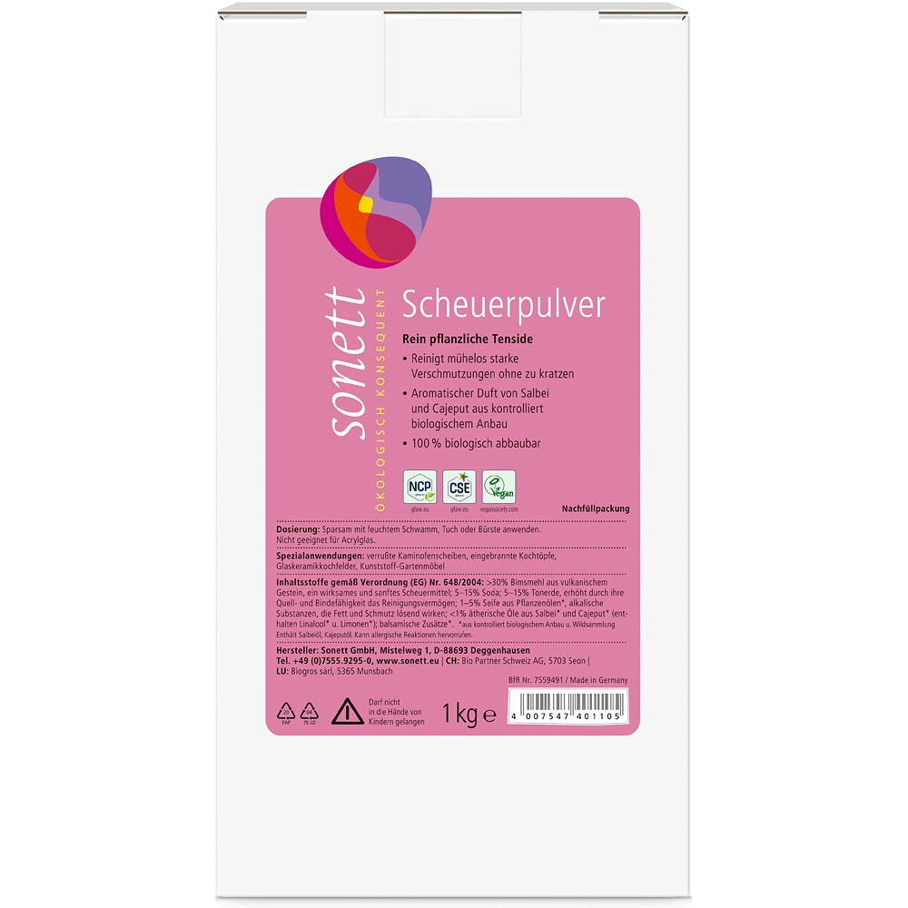 Praful pentru curatat suprafete Sonett curata fara efort murdarirea grea fara a zgaria, cu parfumul aromat de salvie si cajeput din agricultura ecologica. Agentul de curatare poate fi utilizat intr-o varietate de moduri in zonele sanitare si de bucatarie. 100% biodegradabil.