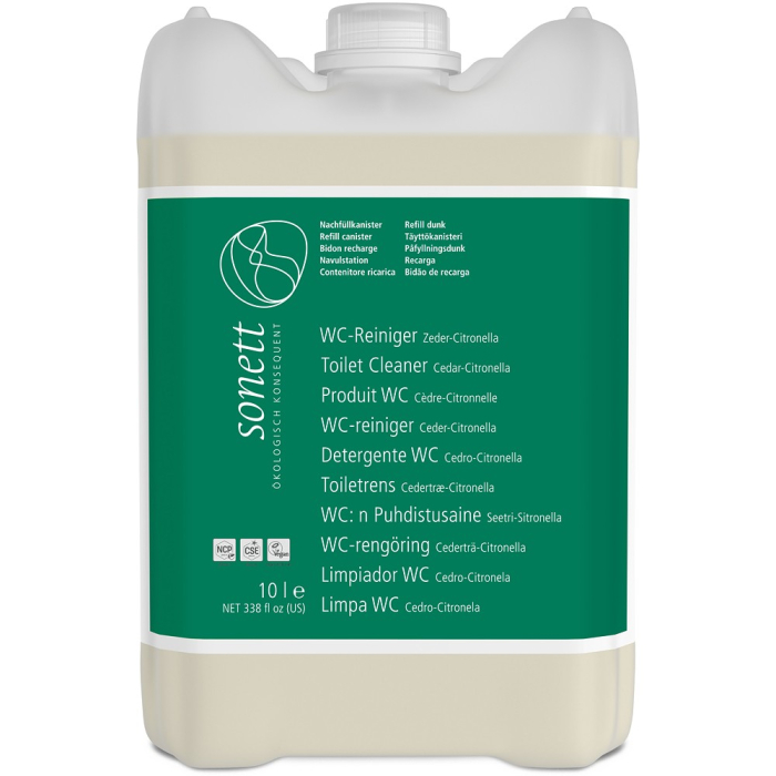 Solutie de curatat toaleta Sonett cedru-citronella. Datorita aderentei bune a produsului la peretii vaselor de toaleta, intreaga eficienta este pe deplin utilizata. Amestecul de uleiuri esentiale cu ulei de conifere asigura o reducere eficienta a germenilor si un miros proaspat.