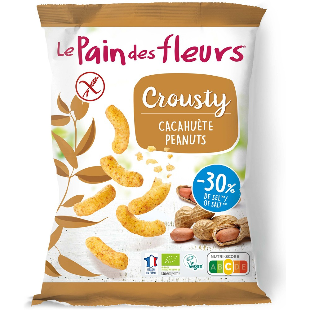 faina de porumb*, arahide* (27%) prajite si macinate, ulei de floarea-soarelui*, sare de mare, piper*, pudra de usturoi*, antioxidant: extract de rozmarin*. *provin din agricultura ecologica.